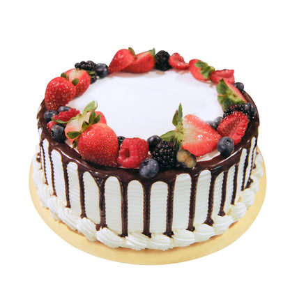 Chocolate sponge cake with a layer of cream and canned mixed fruit cocktail inside. Chocolate drips along the sides and an assortment of fruits are placed on top. Fruits will vary.